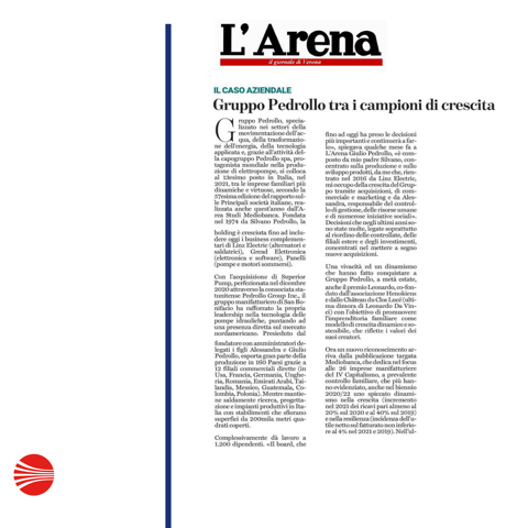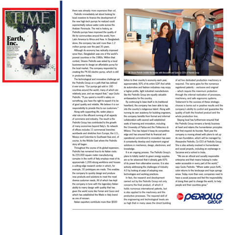 Giulio Pedrollo, PDG de Pedrollo SpA et du Groupe Pedrollo, interviewé sur Newsweek : Nous représentons le « Made in Italy », synonyme de produit efficace, de beauté et de haute qualité au juste prix ». « Traiter l’eau avec respect est la meilleure façon de comprendre notre groupe. Nous voulons respecter l’eau, ce qui signifie beaucoup de choses en ce qui concerne nos produits : de l’utilisation de l’acier inoxydable et de meilleurs matériaux à la façon dont nous produisons nos électropompes.