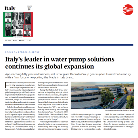 Italy’s Finest Part One de DIE WELT célèbre la croissance, la compétitivité et les réalisations innovantes de l’Italie, ainsi que les mesures prises par notre pays pour promouvoir la croissance économique en collaboration avec l’Allemagne. Le Groupe Pedrollo figure également parmi les entreprises mentionnées par Die Welt, un des journaux allemands les plus réputés, dans son enquête consacrée à l’économie italienne. Disponible en version imprimée et en ligne.