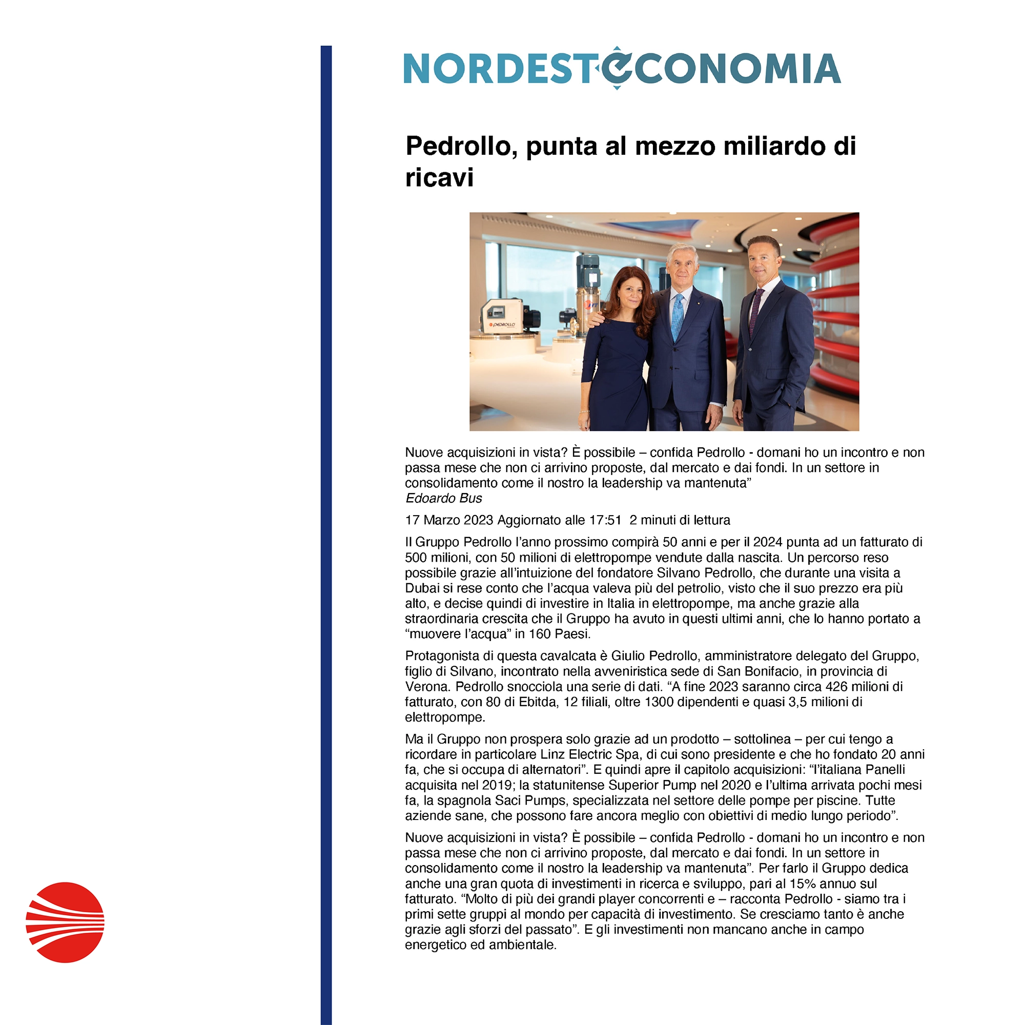 Pedrollo, vise un demi-milliard de chiffre d’affaires